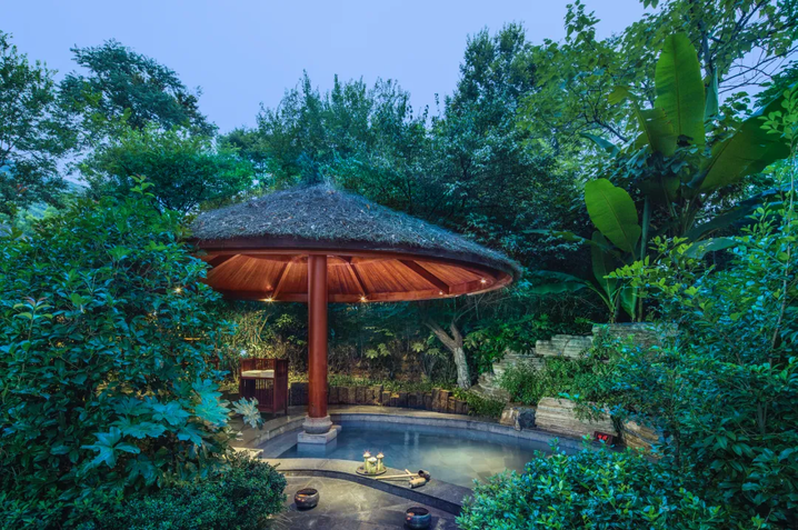 Yushui Hot Spring in Tianmu Lake Resort, a 5A tourist attraction of China, is tucked within a lush bamboo forest and surrounded by tea gardens.