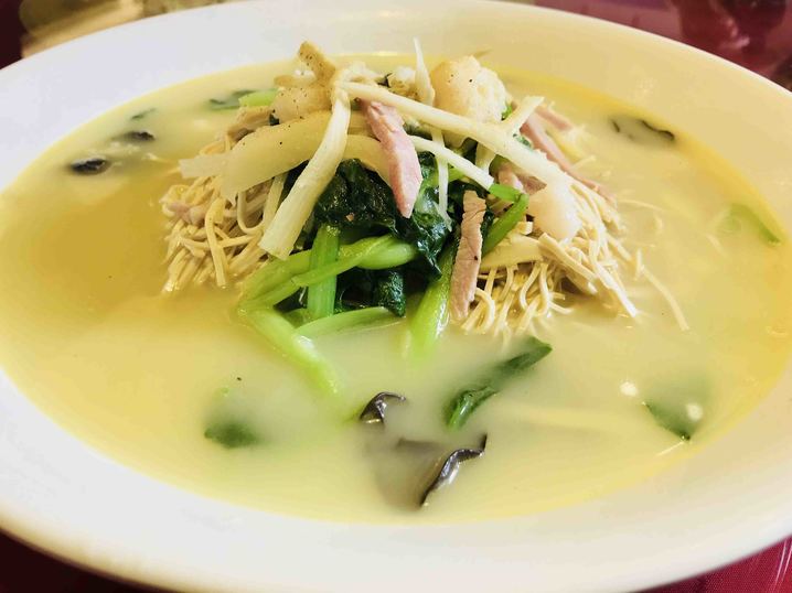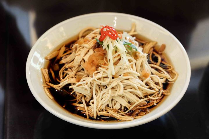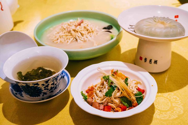 A traditional menu of Taizhou Morning Tea consists of "one tea, three snacks and one noodle". The tea refers to a cup of tea and one bowl of hot kan-ssu (shredded tofu with broth). The three snacks refer to three kinds of famous breakfast dim sum such as steamed buns, steamed dumplings and Shaomai, a dumpling with sticky rice and various meats as stuffing. The one noodle is usually fish soup noodle.