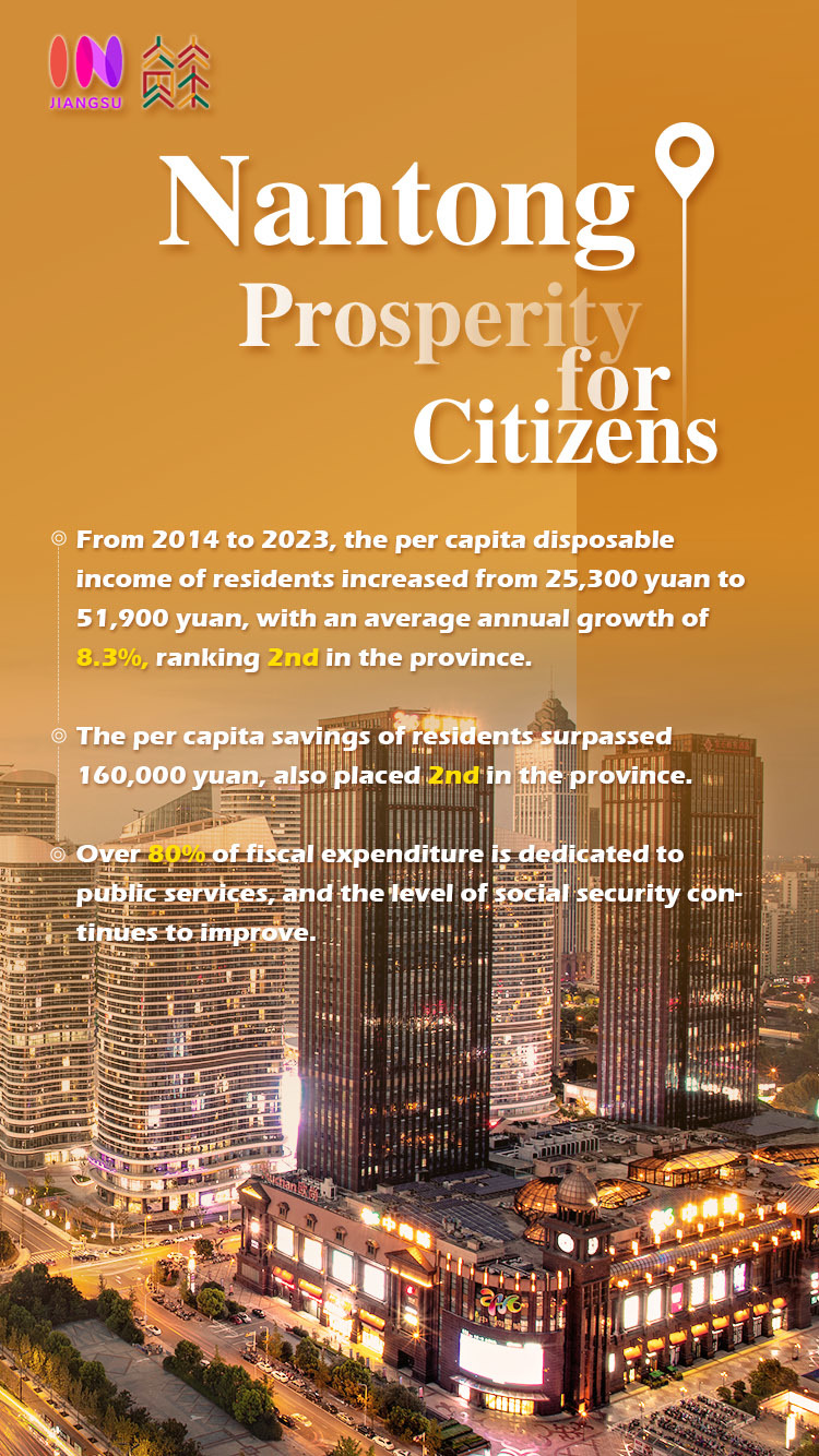 Since entering the trillion-yuan city club in 2020, Nantong's economic output has grown by an average of 5.3% annually over the past four years, ranking 7th among 26 of the trillion-yuan cities nationally. The per capita disposable income of residents increased from 25,300 yuan in 2014 to 51,900 yuan in 2023, with an average annual growth of 8.3%, ranking 2nd in the province.