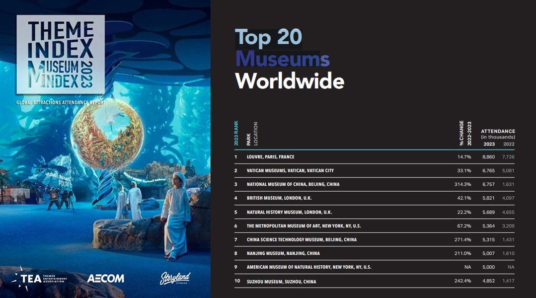 World's infrastructure consulting firm AECOM together with Themed Entertainment Association (TEA) released Theme Index and Museum Index 2023: The Global Attractions Attendance Report recently. Seven Chinese museums have made it into the Top 20 Museums Worldwide, Nanjing Museum and Suzhou Museum are among the Top 10.