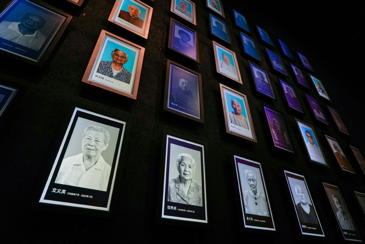 Light boxes of Nanjing Massacre survivors Ai Yiying, Wu Xiuying, Yi Lanying and Tao Chengyi (L-R in the bottom row), who passed away this year, are seen on the photo wall at the Memorial Hall of the Victims in Nanjing Massacre by Japanese Invaders, in Nanjing, East China's Jiangsu province, March 11, 2025. [Photo/Xinhua]